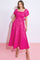 Indulge in the luxurious elegance of our solid woven midi dress, boasting an off-shoulder neckline, short puff sleeves, a smocked bodice, and a self sash tie.