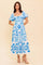 A printed woven midi dress featuring sweetheart neckline, short puff sleeve, ruffled hemline and smocked back bodice