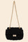 This chic crossbody bag features a luxurious textured black fabric construction with a sophisticated bouclé or quilted finish. The bag is accented with gleaming gold-tone hardware including a classic turn-lock closure and dual chain straps for versatile styling. Its compact size makes it perfect for carrying essentials while maintaining an elegant silhouette. The timeless black color and refined texture make this bag suitable for both casual and formal occasions, offering the perfect blend of style and functionality.