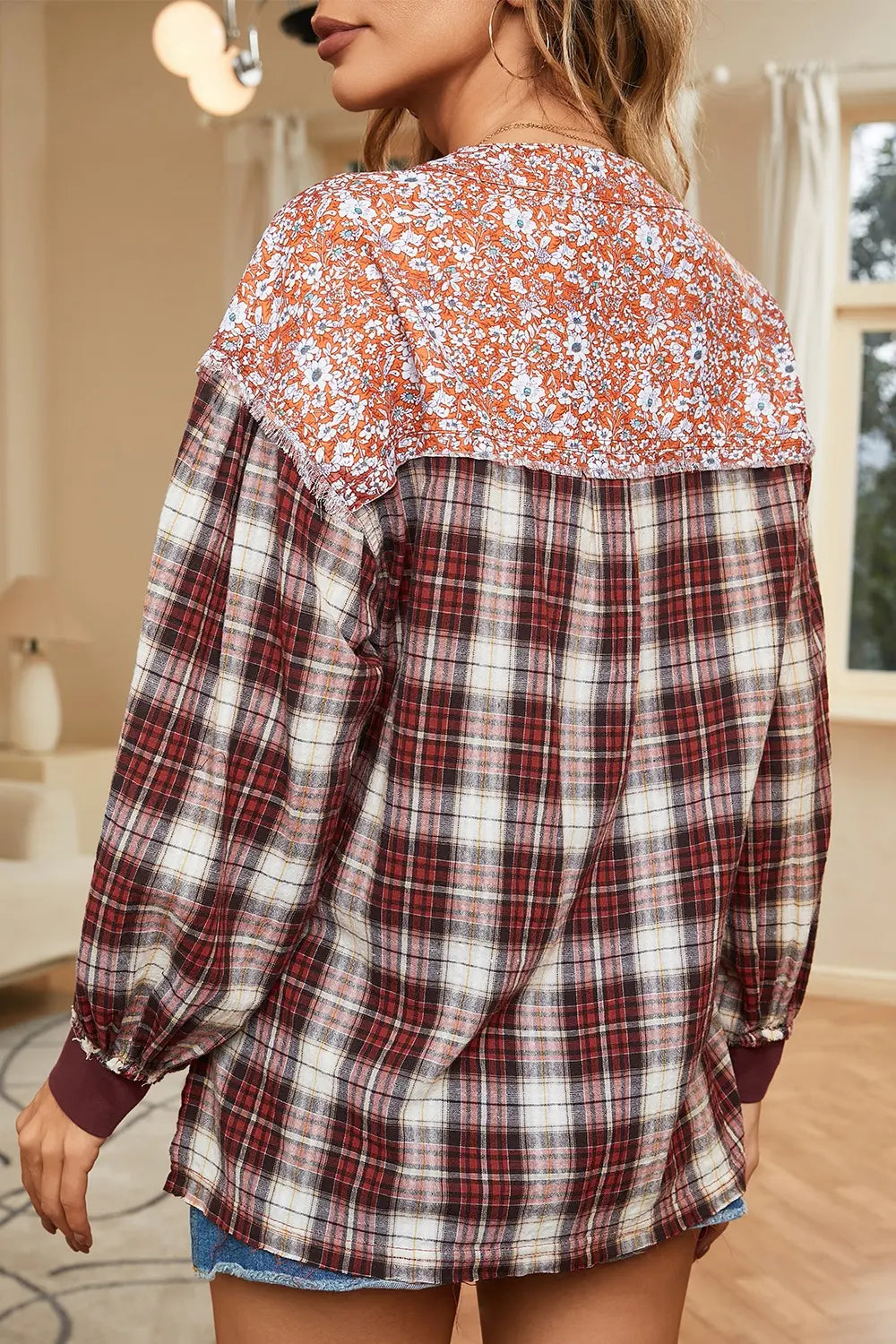 Plaid Notched Neck Slit Blouse