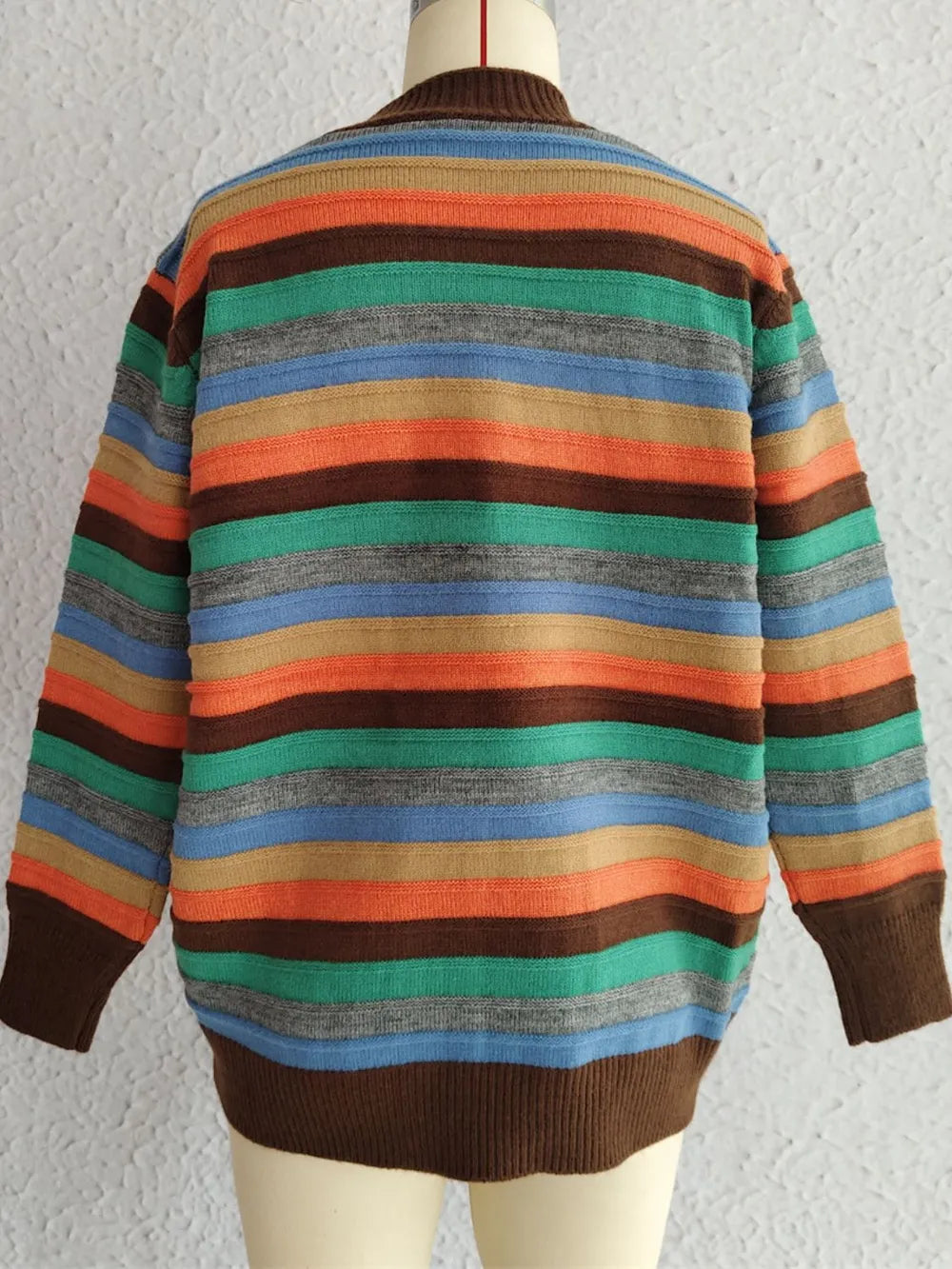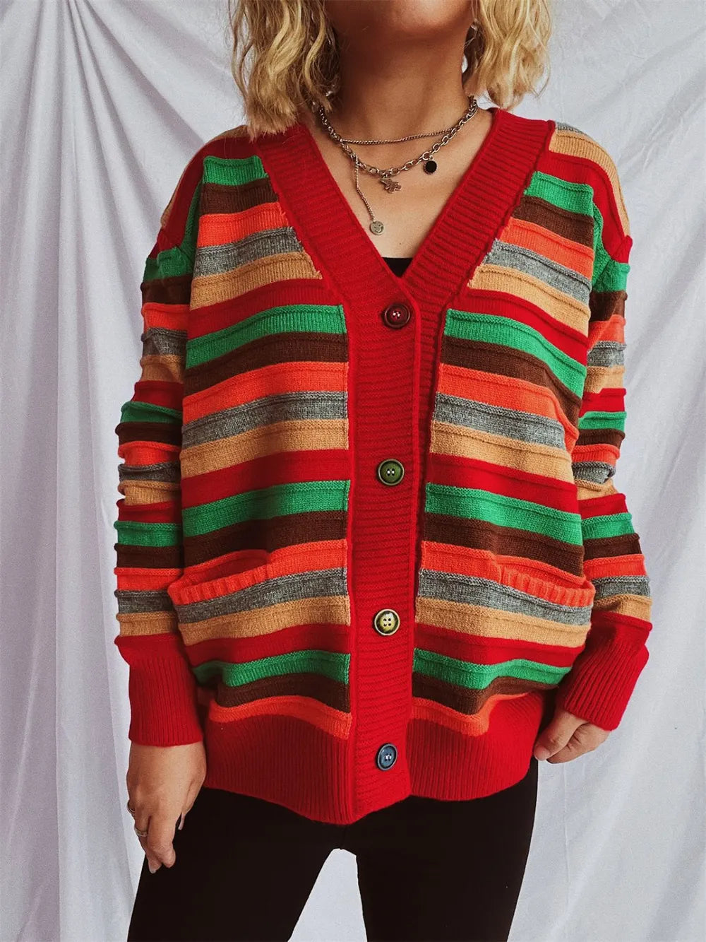 Contrast Stripes Button Up Long Sleeve Cardigan