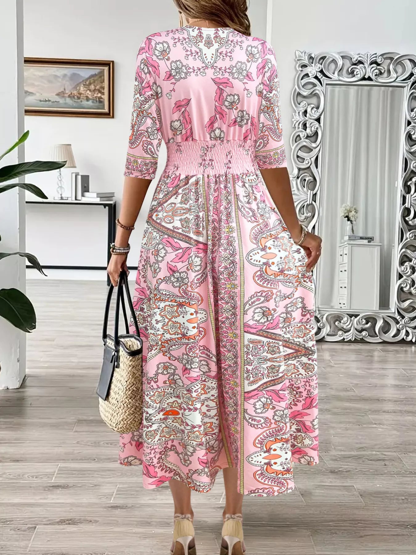 Smocked Printed Half Sleeve Midi Dress