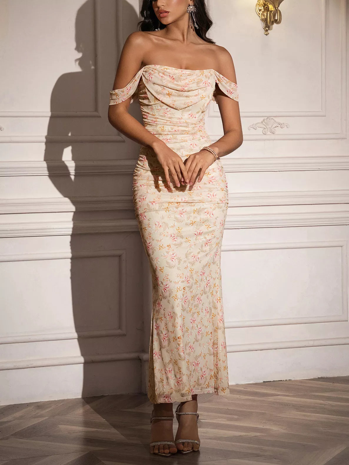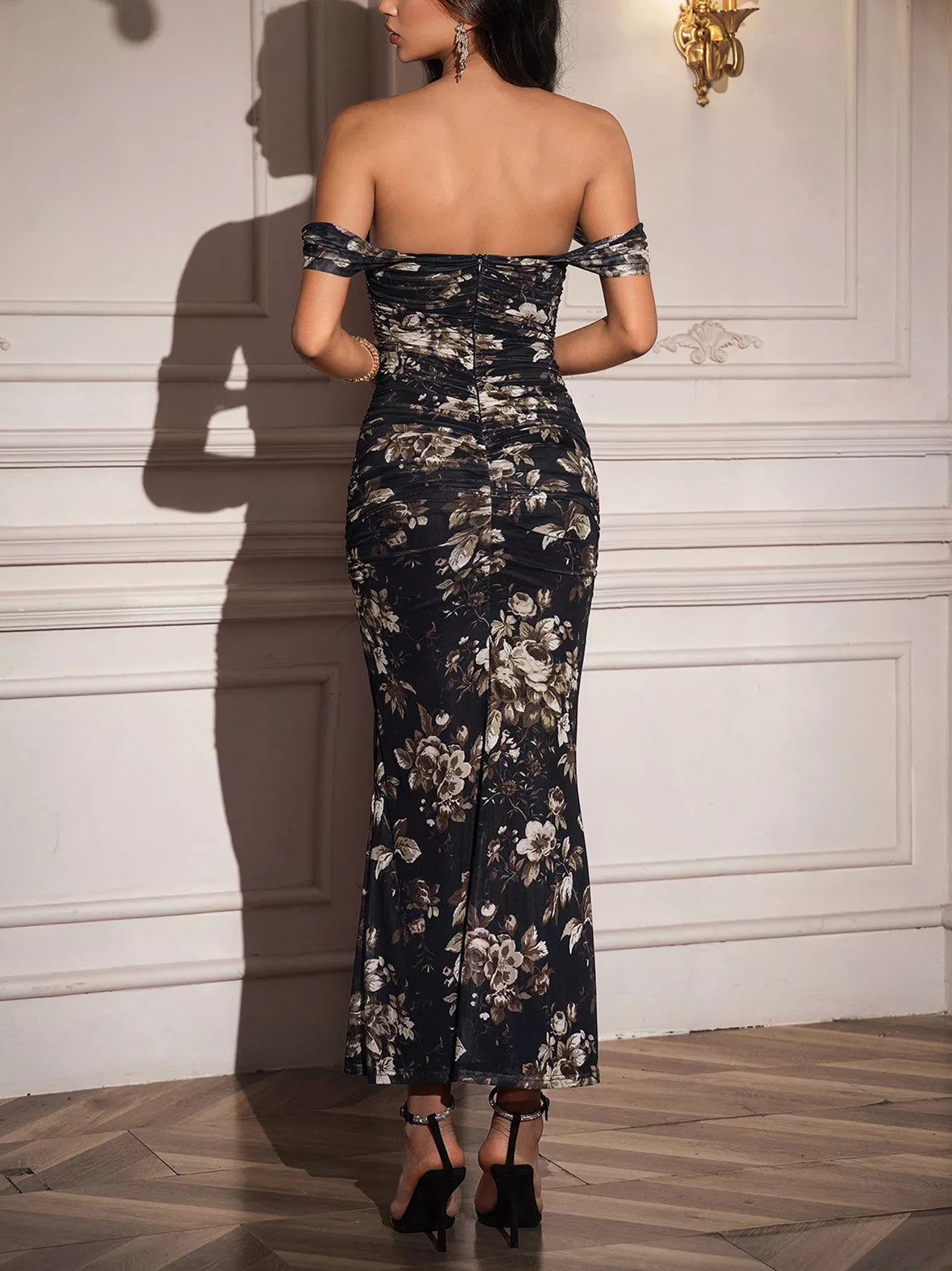 Off-Shoulder Ruched Floral Mermaid Dress