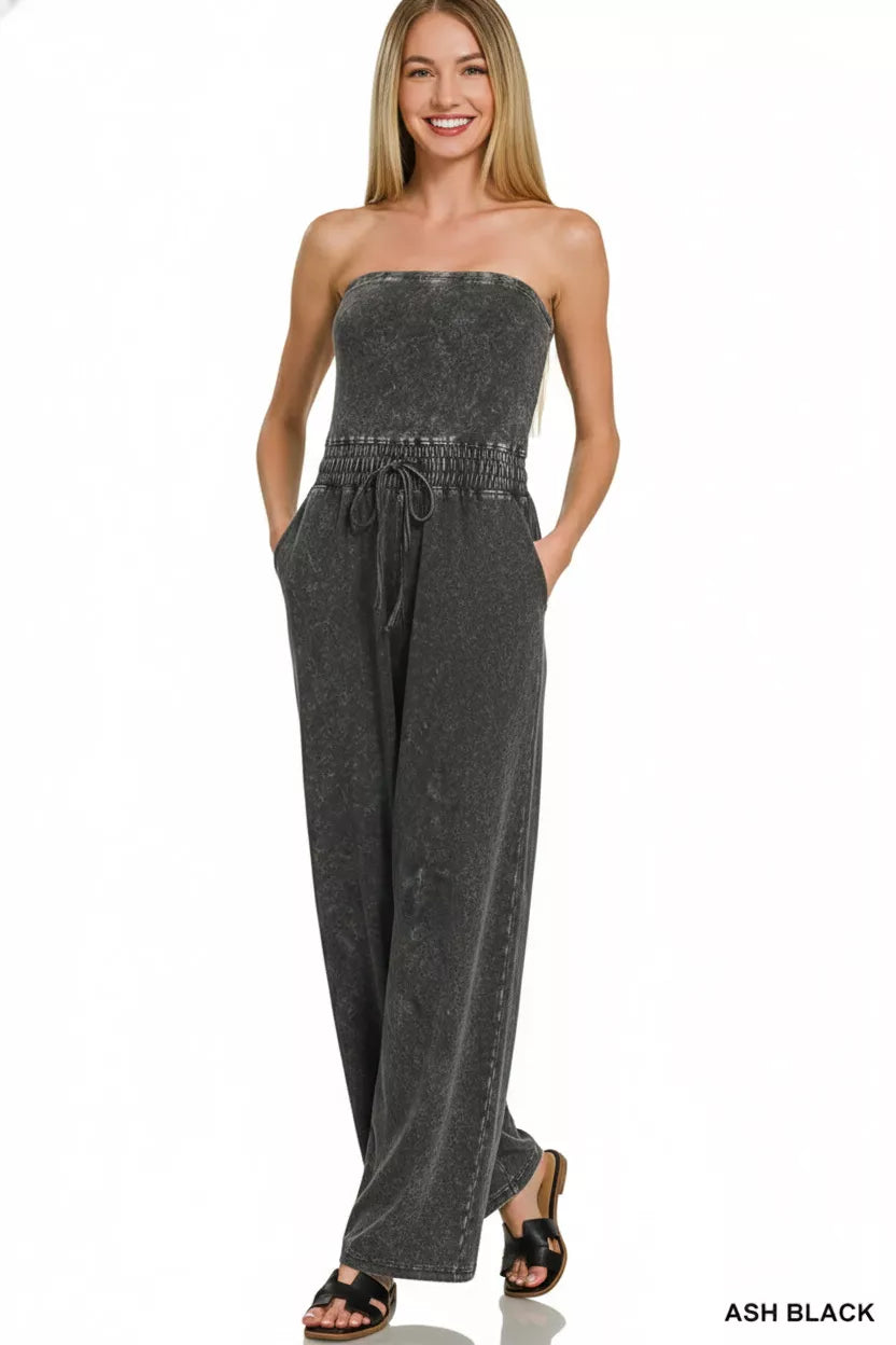 Zenana Acid Washed Strapless Tube Top Jumpsuit