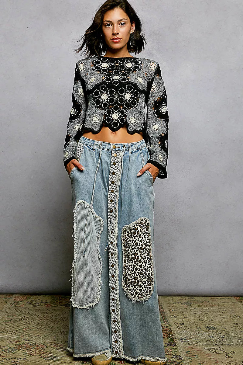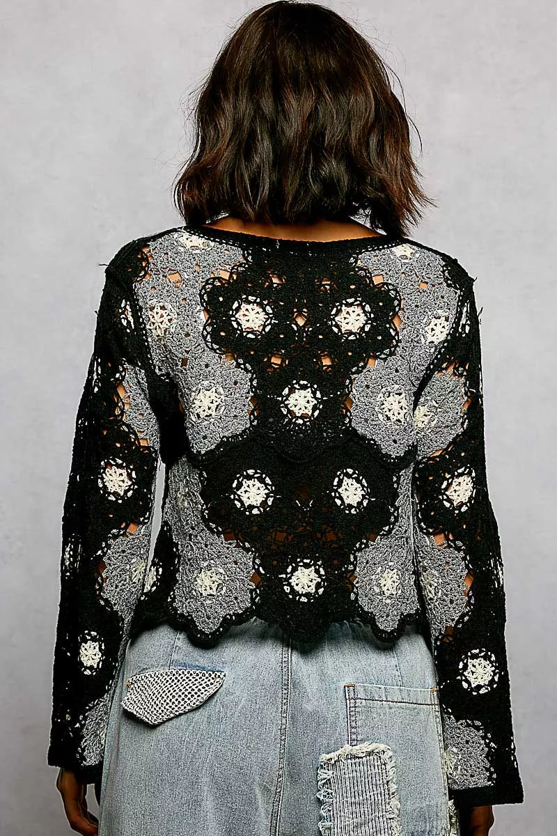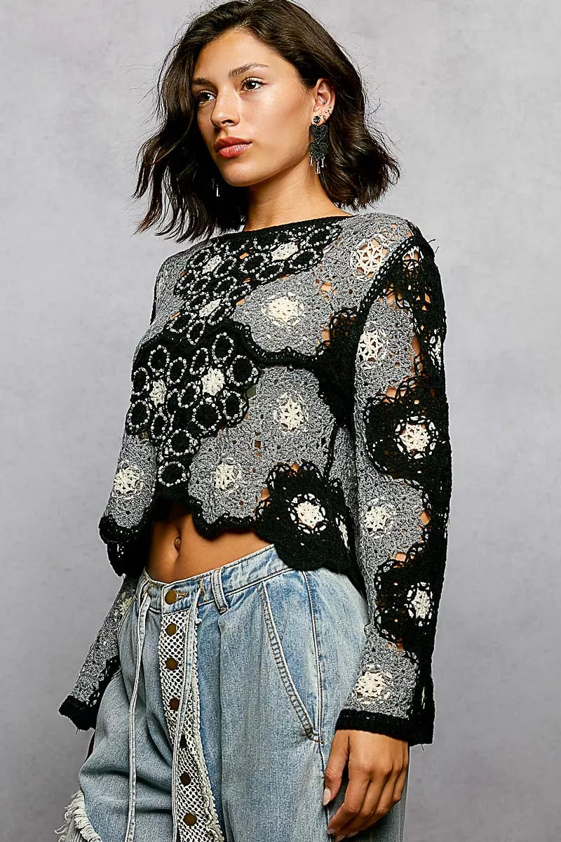 The round neck Long Sleeve Crochet Top with Floral Weave Knit Patterns and Bead Detail is a unique and stylish piece that combines intricate craftsmanship with feminine charm. The floral weave knit patterns add a delicate and romantic touch to the top. The beads detail enhances the design with a subtle touch of elegance and texture. With a relaxed fit and long sleeves, it offers both comfort and sophistication. Embrace a bohemian-inspired look with this beautifully designed crochet top that is sure to make a statement!