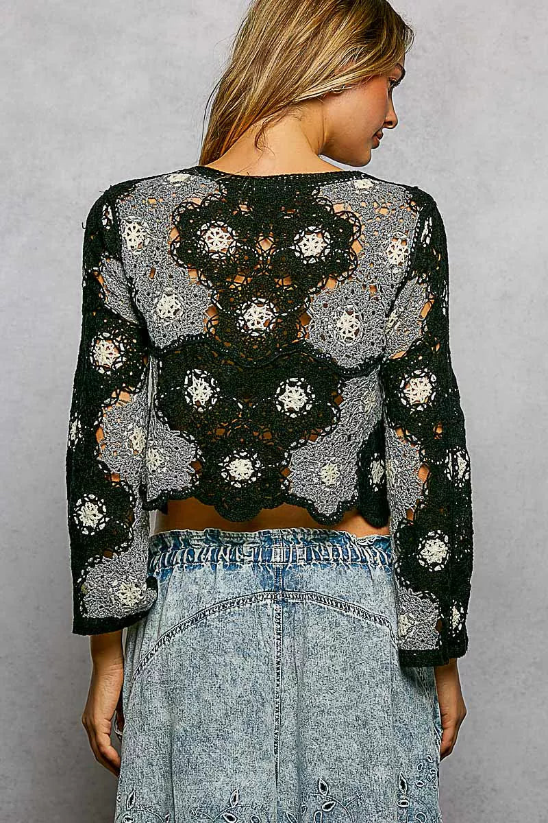 POL Floral Weave Pattern Crochet Cropped Top with Beads Detail