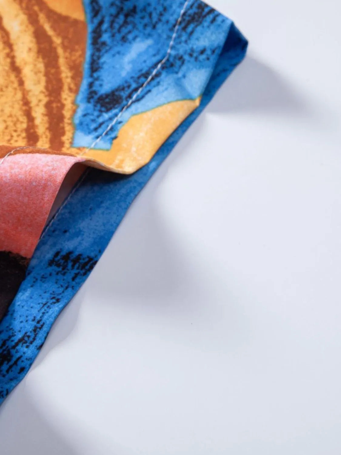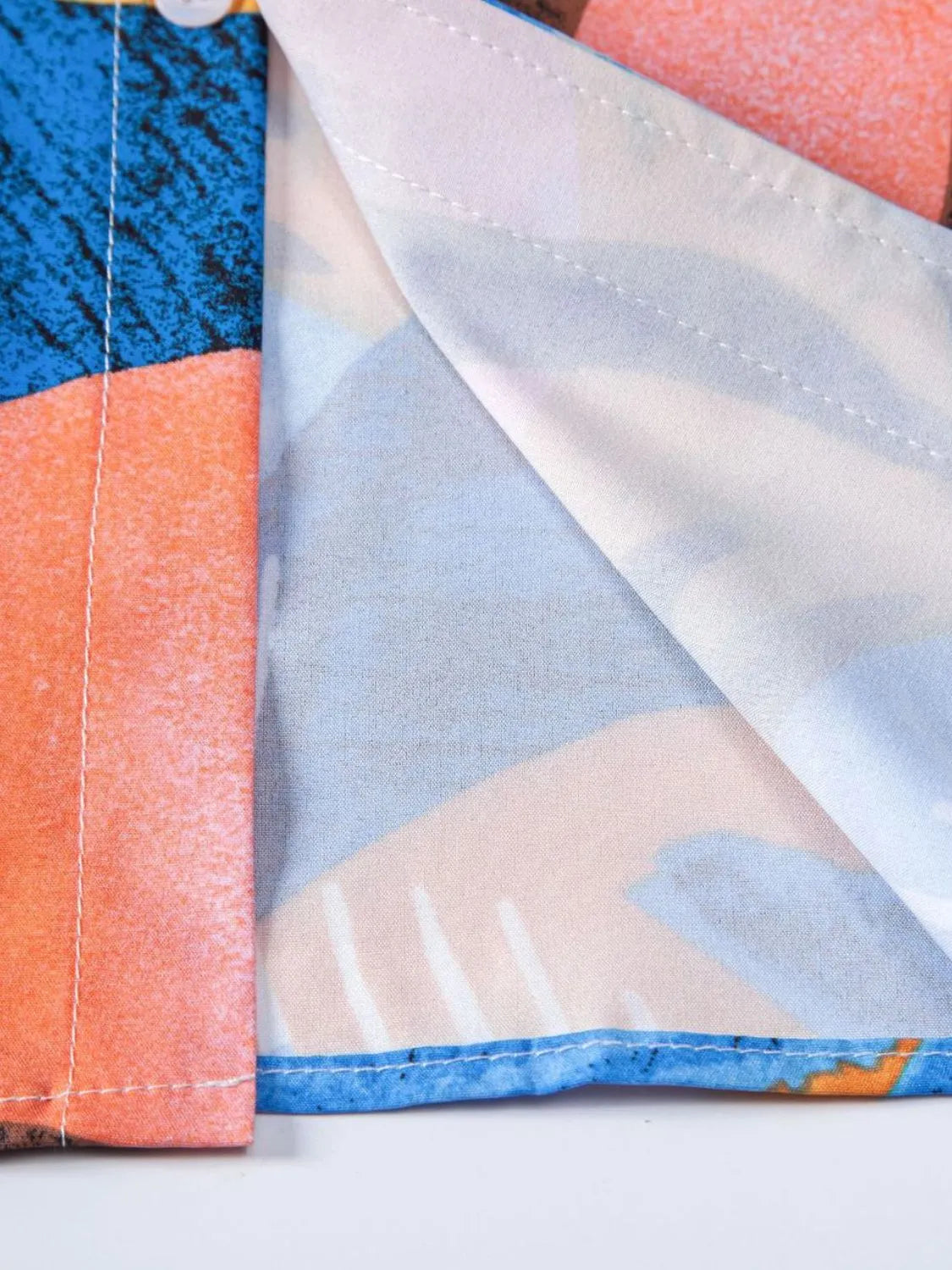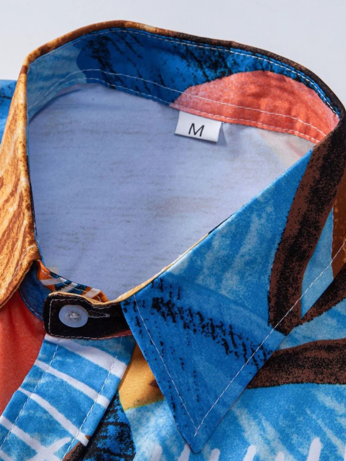This eye-catching Hawaiian shirt features a stunning tropical print with oversized leaf motifs in vibrant blue, orange, and golden hues. Made from lightweight, breathable fabric perfect for warm weather, the shirt showcases a relaxed fit with casual rolled-up short sleeves. The all-over abstract leaf pattern creates a modern take on classic tropical style. Button-down front closure and collar maintain a structured look while keeping the overall vibe casual and beach-ready. Ideal for summer parties, vacation wear, or any casual occasion requiring a bold statement piece.