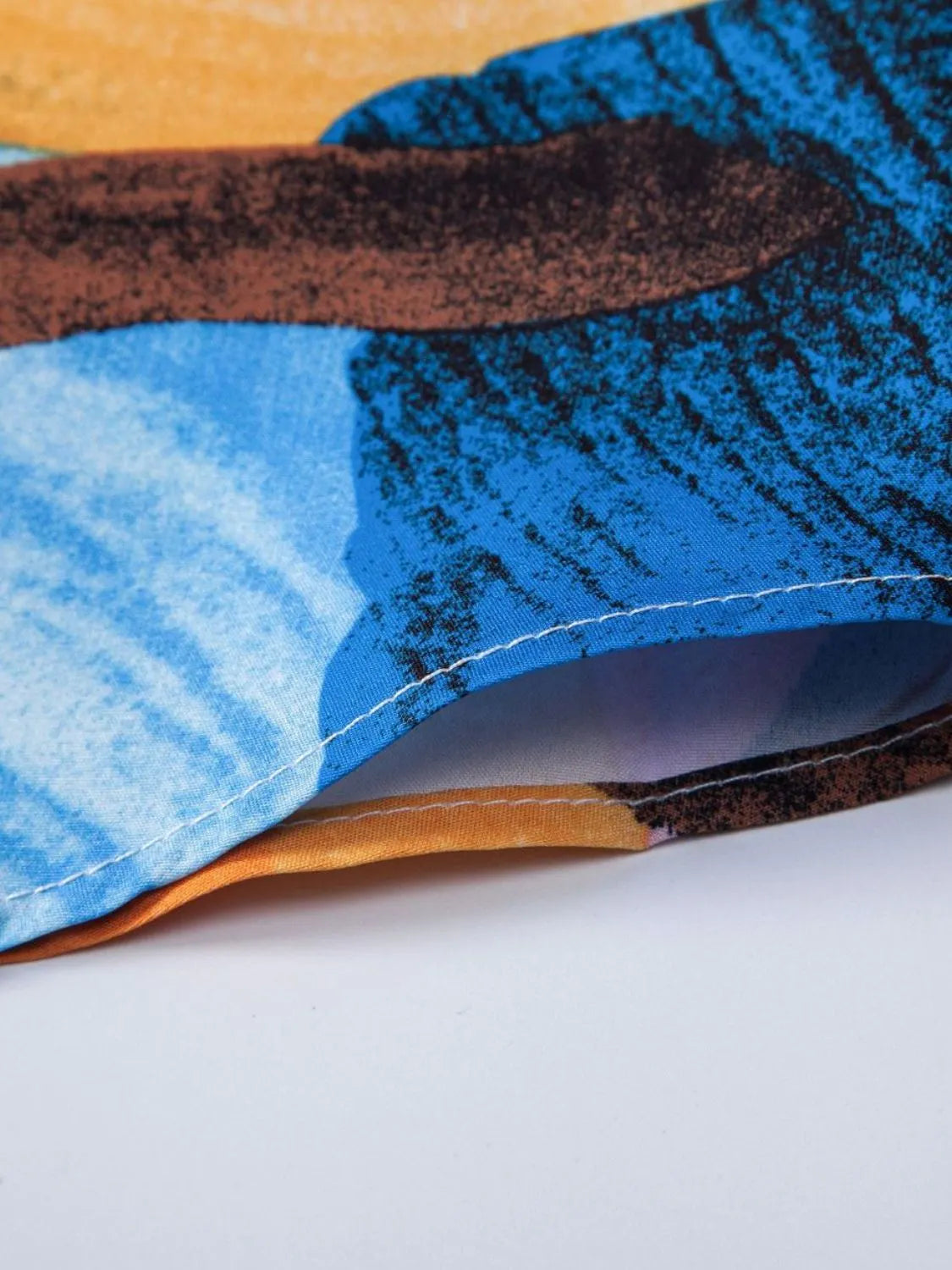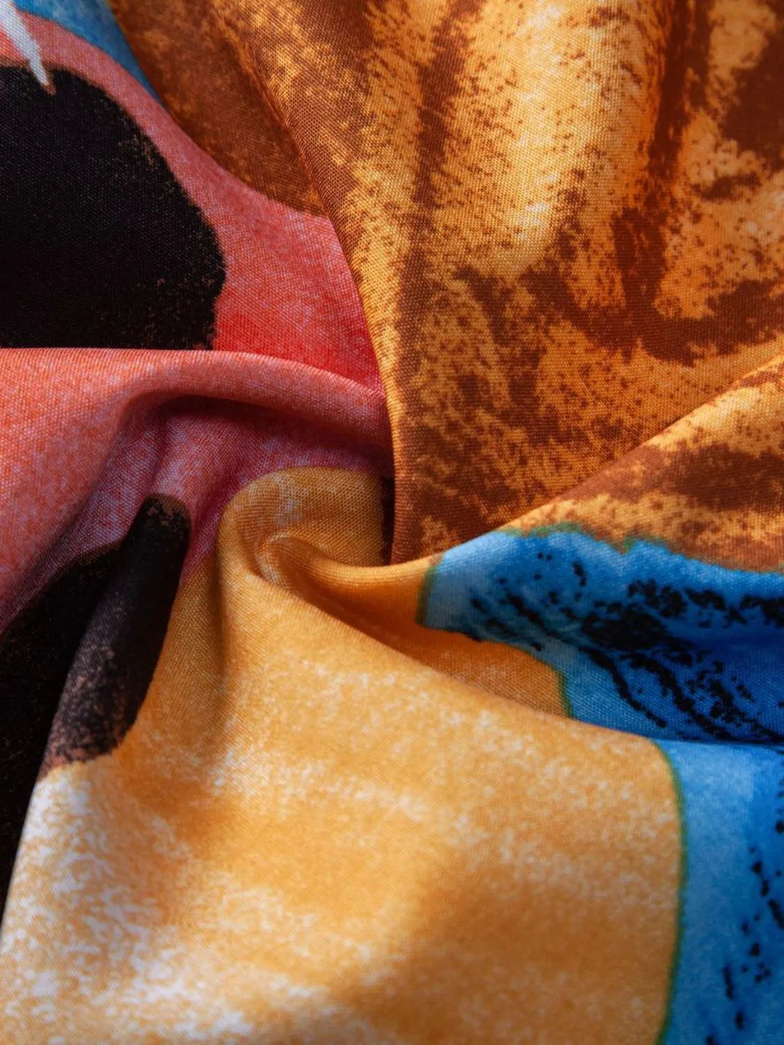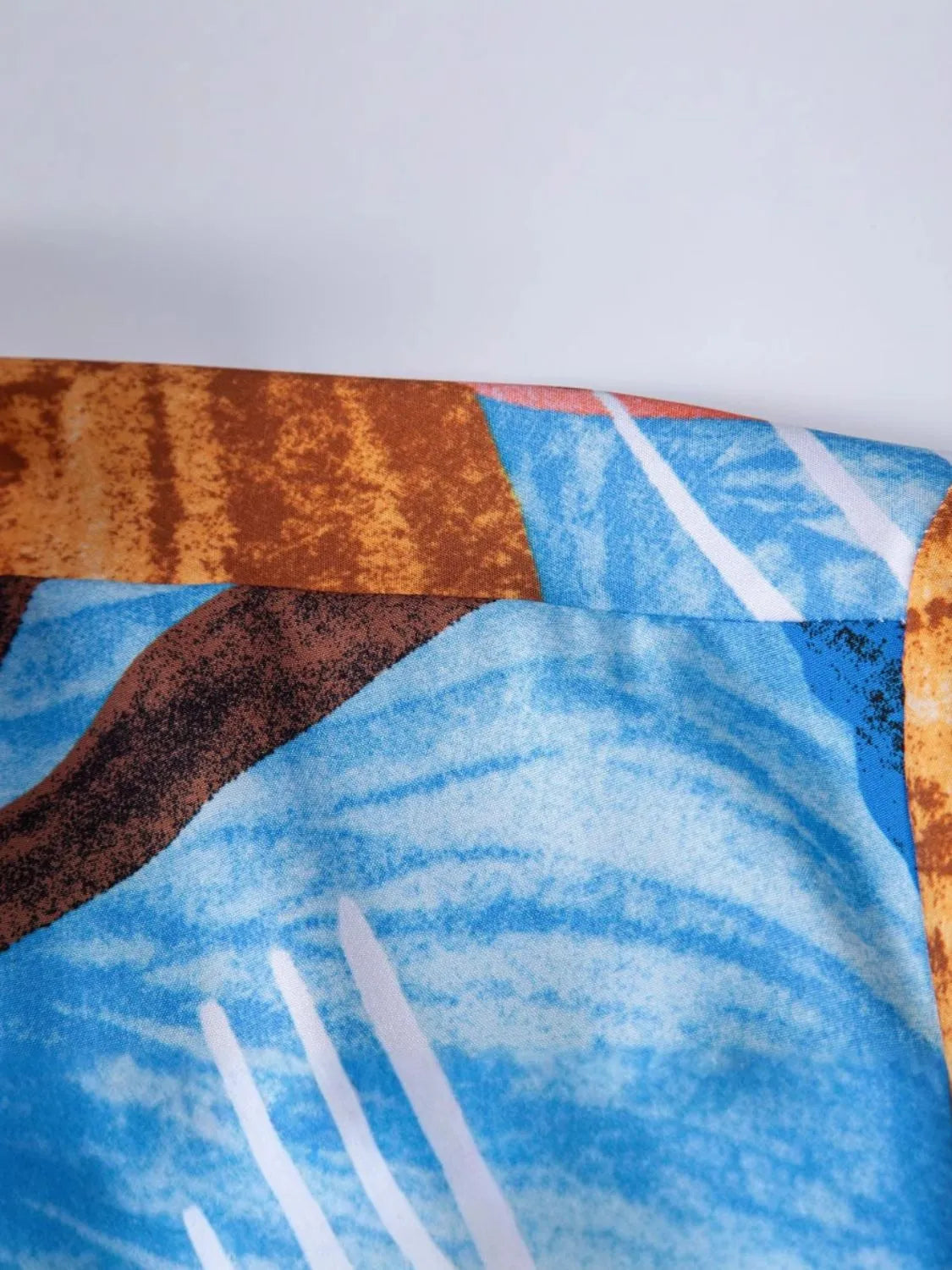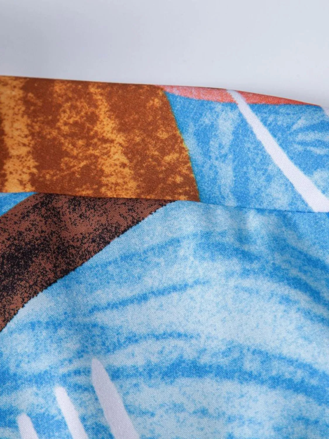 This eye-catching Hawaiian shirt features a stunning tropical print with oversized leaf motifs in vibrant blue, orange, and golden hues. Made from lightweight, breathable fabric perfect for warm weather, the shirt showcases a relaxed fit with casual rolled-up short sleeves. The all-over abstract leaf pattern creates a modern take on classic tropical style. Button-down front closure and collar maintain a structured look while keeping the overall vibe casual and beach-ready. Ideal for summer parties, vacation wear, or any casual occasion requiring a bold statement piece.