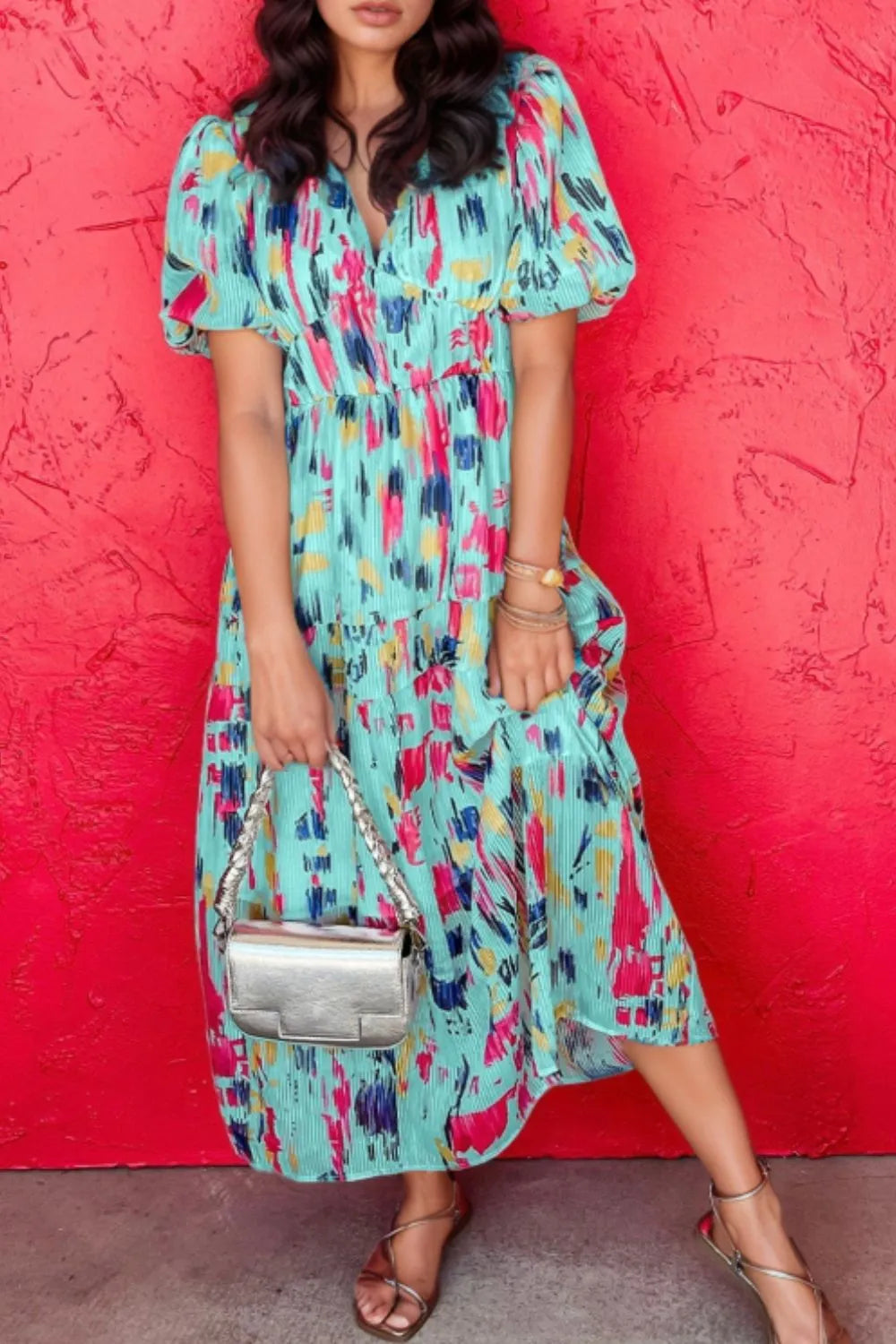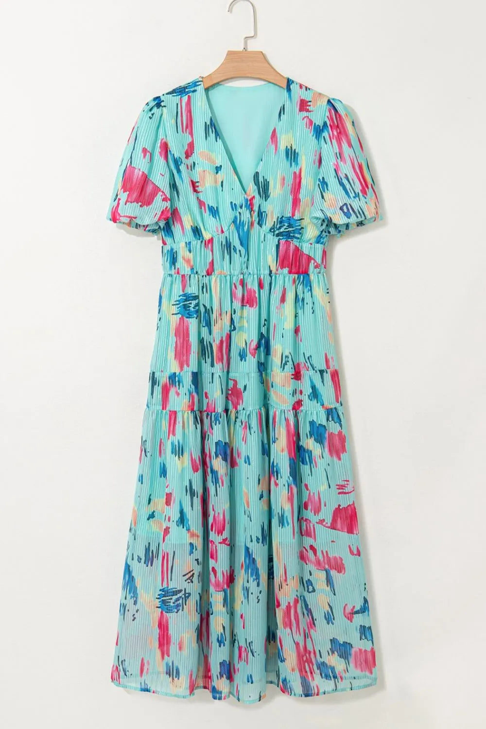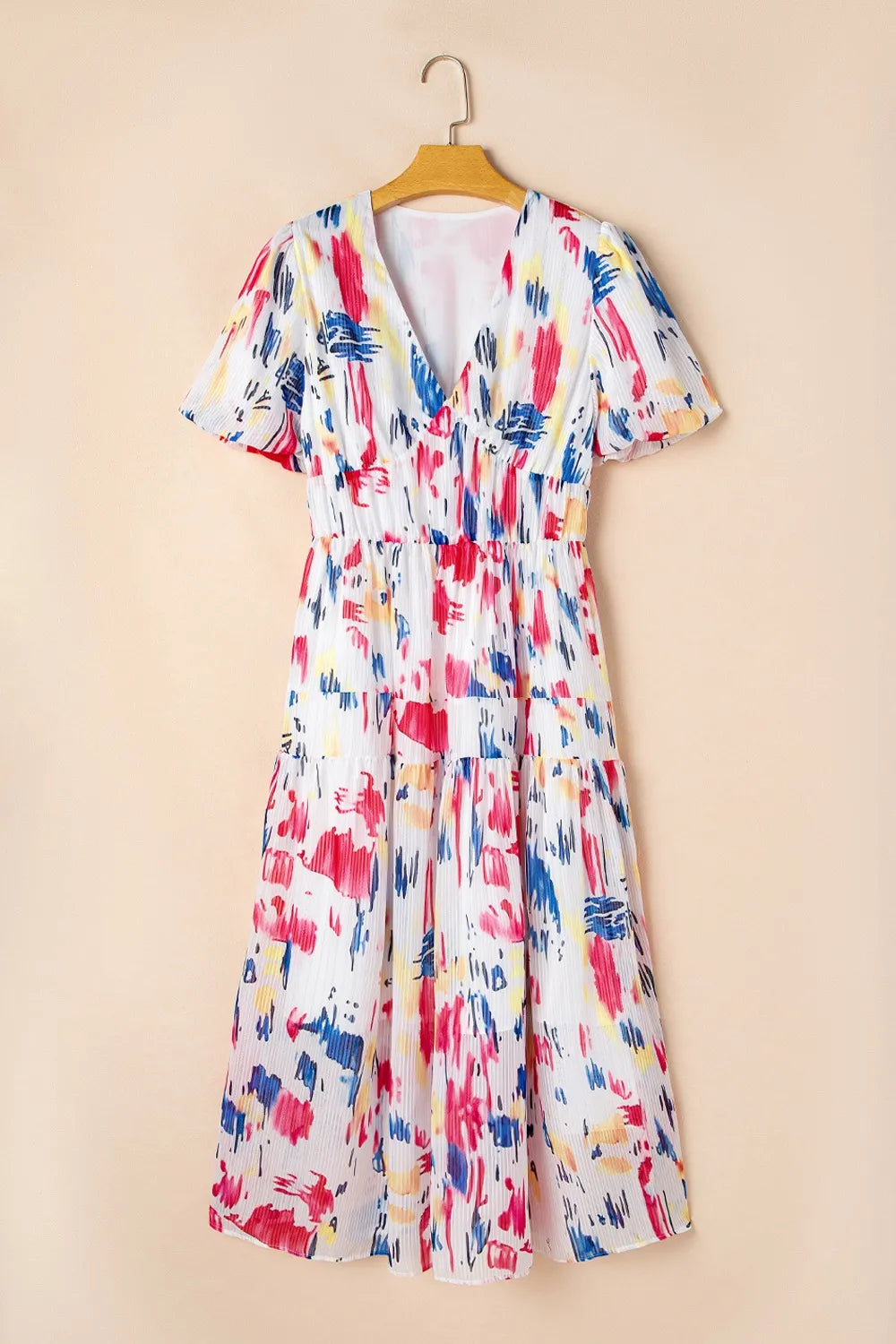 Abstract Print Short Puff Sleeve Tiered Maxi Dress