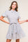 A striped woven mini dress featuring shirt collar, button down, short puff sleeve, self sash tie and ruffled hemline