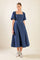A washed denim midi dress featuring square neckline, short puff sleeve, self belt, full skirt, smocked back with zipper closure
