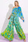A printed woven jumpsuit featuring one shoulder neckline, scarf sleeve, elasticized waist with self sash tie and fully pleated pant