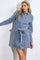 A washed denim mini dress featuring shirt collar, button down, long sleeve and self sash tie
