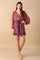 A printed woven mini dress featuring surplice neckline, long sleeve, elasticized waist with self sash tie and full skirt