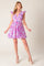 A pink and blue printed woven mini dress featuring V neckline, ruffled sleeve, waist yoke, full skirt, bare back with tie closure.