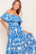 A printed woven midi dress featuring off shoulder neckline with flounce, ruffled hem and back zipper closure