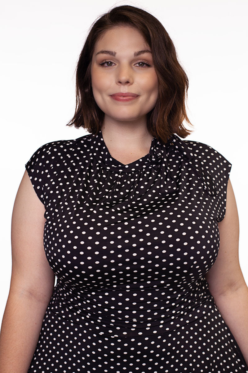 Show off your inner pinup in our Bridget Bombshell dress! A classic dress known for comfort without compromising style; the Bombshell boasts a side tie on the neckline, short sleeves, and figure-flattering shirring detail on the waist. The fabric is smooth and stretchy, so you can rock your favorite retro look from work to play and beyond!