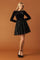 A woven mini dress featuring round neckline, ling sleeve, bow at waist band, contrasting full skirt and back zipper closure