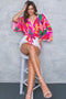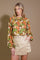 A printed woven top featuring round neckline, raglan sleeve, blouson long sleeve and back neck button closure