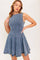 A washed denim mini skirt featuring round neckline, sleeveless, circle skirt and back zipper closure