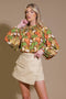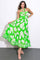 A printed woven midi dress featuring halter neckline, center front cut out detail, wide waist band, ruffled hemline and smocked back bodice