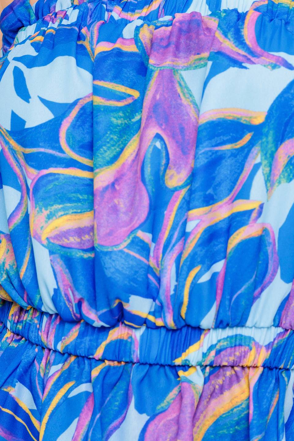 A printed woven top and pant set. Top featuring straight neckline with ruffled edge, straps, elasticized waist and peplum. Pant featuring elasticized waist, front tie and wide leg