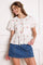 A solid embroidered woven top featuring round neckline, front bow ties, short puff sleeve and peplum