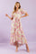 A printed woven lace midi dress featuring surplice neckline, short puff sleeve, self sash, faux wrap with hi-lo and ruffled hemline