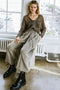 An acid washed light weight denim mini dress featuring high neckline with side tie, long sleeve, ruffled hemline and back zipper closure