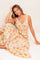 A printed woven maxi dress featuring V neckline, smocked waistband and tiered skirt with ruffled edge.