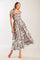 A printed woven midi dress featuring straight neckline with ruffled edge, shoulder tie, smocked bodice and full skirt