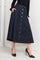 A denim circle skirt featuring self belt, front button down and wide hemline