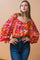 A printed woven top featuring sweetheart neckline and long sleeve with ruffled cuff