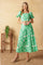 A printed woven top and skirt set featuring square neckline crop top with short puff sleeve and smocked back bodice. Matching skirt with side zipper closure