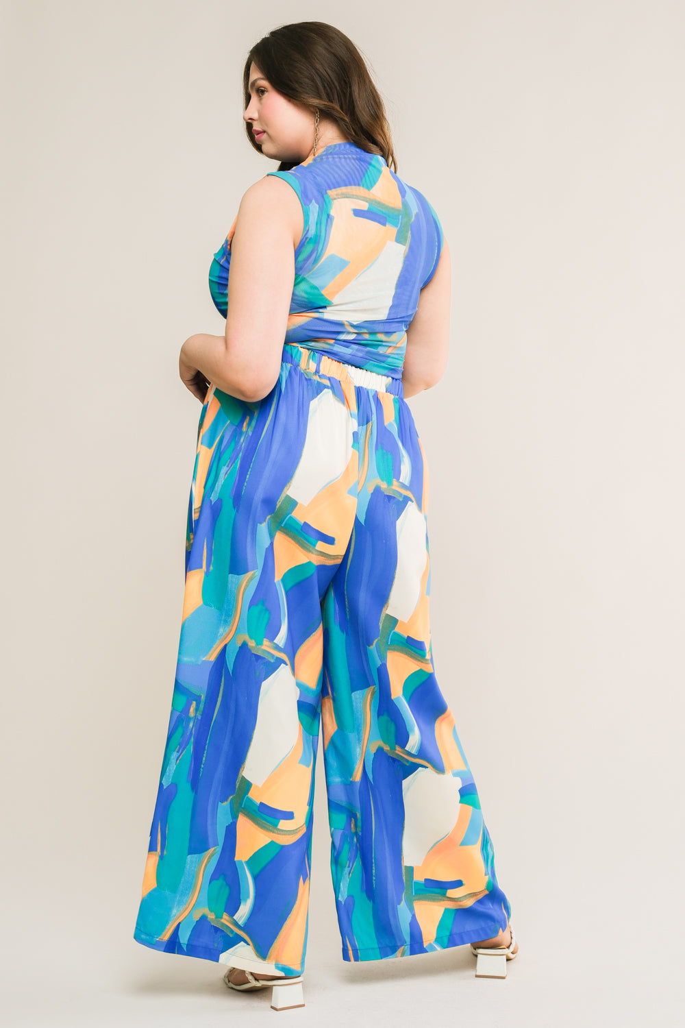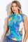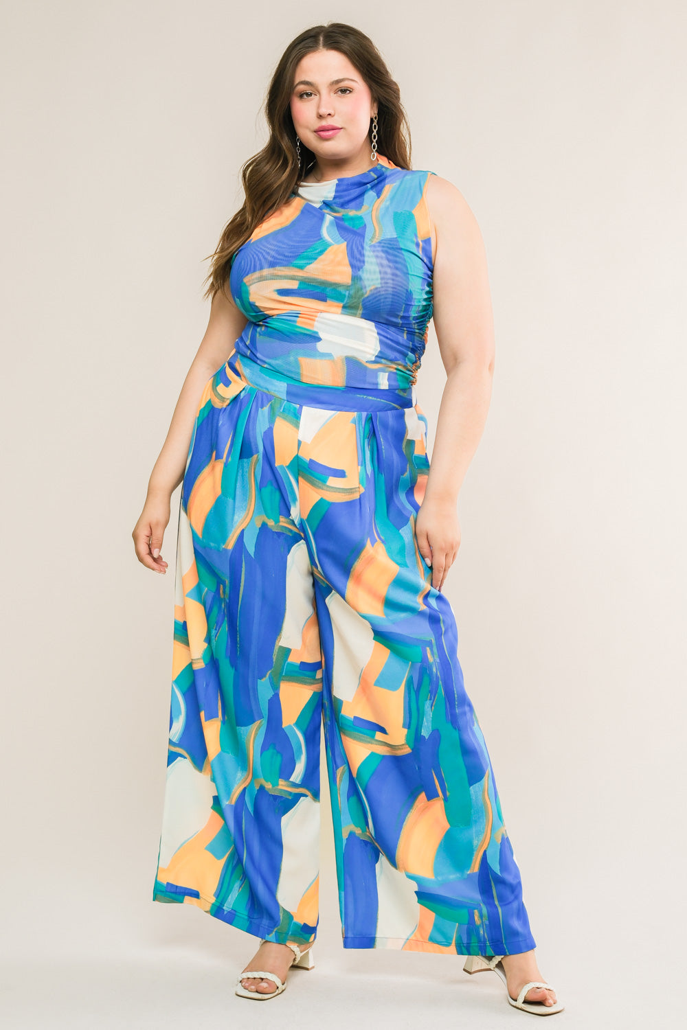 A printed power mesh top featuring high neckline, sleeveless and ruched sides. Matching pant IP8446