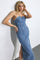 Elevate any look with the DIVINE DREAM Denim Midi Dress. Crafted from washed denim, this stylish silhouette features a strapless neckline, a V cut out at the front, and body-hugging contours that create a feminine and flattering fit. Finished with a back zipper closure and slit for ease of movement, this dress is the perfect addition to any luxury wardrobe.