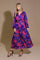 A printed woven midi dress featuring round neckline with V center, long raglan sleeve, loose fit with self sash tie
