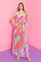 A printed woven jumpsuit featuring surplice neckline, pleated pant, bare back with cross straps