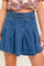 A washed denim skort featuring double self belt, inverted pleats and side zipper closure