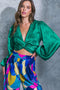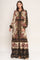 A printed woven maxi dress featuring collar, button down, long sleeve with cuff, self sash tie, and ruffled hemline