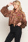 A printed woven top featuring front bow tie, long sleeve with smocked cuff and front button down closure