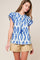 A printed woven top featuring round neckline with front tie and double layer short sleeve with ric rac ribbon trim.