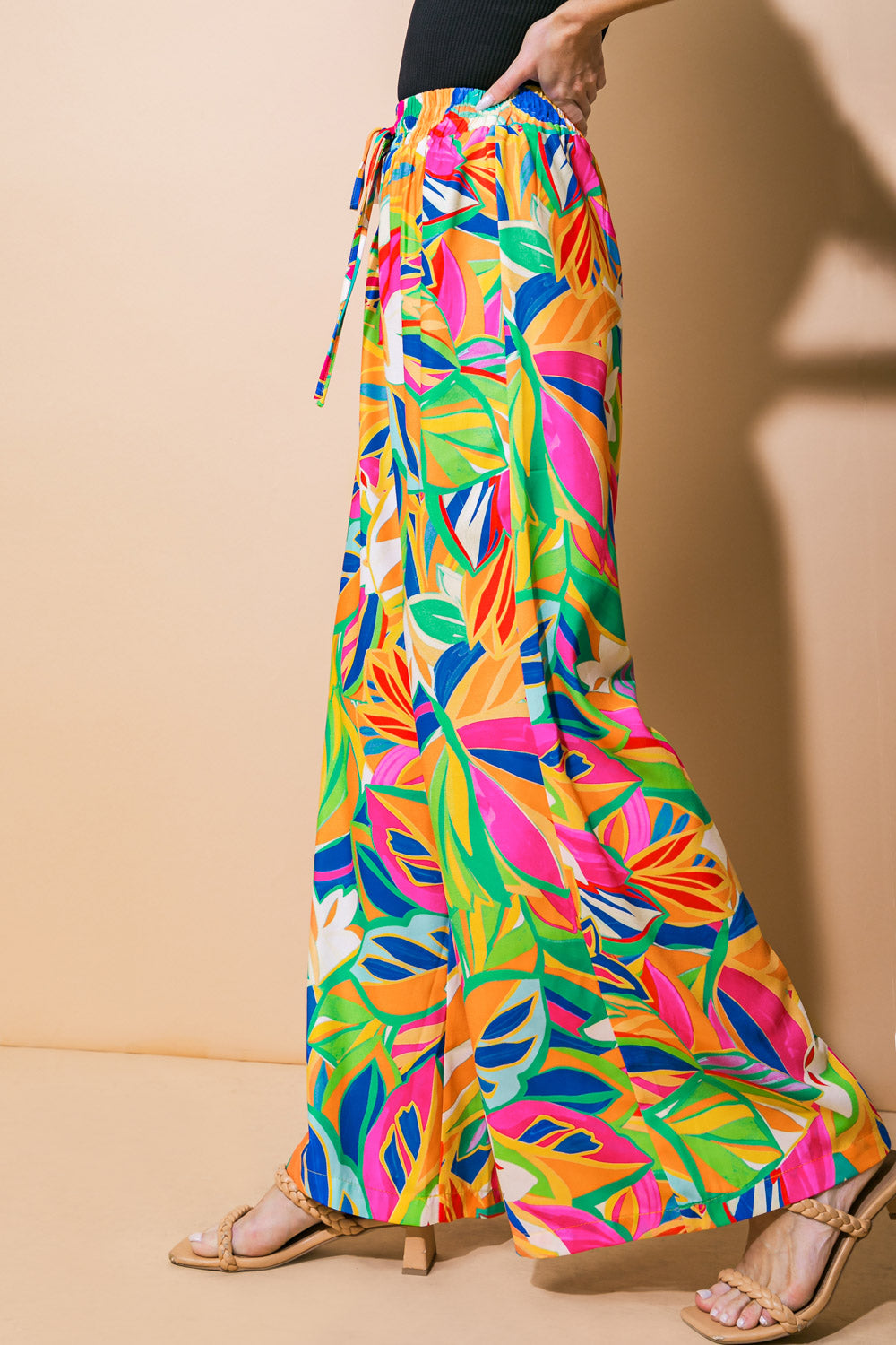 Indulge in the luxurious style and comfort of our ENTERTAIN ME WOVEN PANTS. The printed woven fabric and elasticized waist with tacked tie provide both elegance and convenience. Perfect for all-day wear, these pants are a must-have for any sophisticated wardrobe.