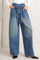 A washed denim pant featuring paper bag waist, front closure, skinny self sash tie, side/back pockets and balloon leg