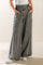 A washed denim pant featuring elasticized waistband, front zipper closure, side pockets and wide leg.