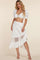 This elegant two-piece ensemble is crafted with a classic design, featuring a puff-sleeved crop top adorned with an oval brooch and a midi skirt with mesh paneling at the sides for an elevated finish. Ruffled trim adds a chic final touch.