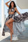 Zebra print maxi dress with a self-tie halter neck, plunging neckline, waist cutouts featuring a O-ring accent at the midriff, and chunky chain detail that is followed by a low waist maxi skirt with a center front slit that reveals a panty underlay.
