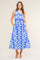 A printed woven midi dress featuring one shoulder neckline, full skirt, side pockets and smocked back waist band