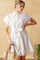 A solid woven mini dress featuring shirt collar, button down, cuffed short sleeve, self sash and embroidered skirt
