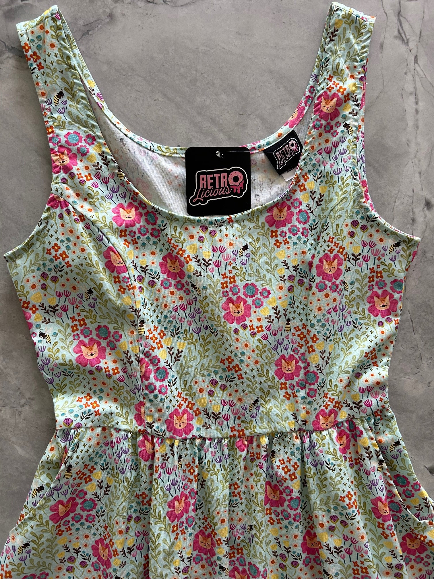 For all of our cat lovers out there, we have a new dress for you! This vintage inspired dress features a scoop front and back, elasticized back waist for ease of wear, longer length a-line skirt with hidden side pockets, and back zippered closure - now available in our whimsical Floral Cats print.